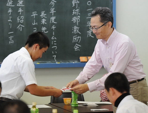 出席した陵球会の山中会長は15万円分の目録を曽我主将へ贈呈。 その時々に必要な道具の購入費にと毎年贈られているもので、今年は捕手用の防具、バット、ボールなどに充てられる。 部員らの母親からも一つ一つ心を込めたという千羽鶴が贈られ、「力を出し切って」と選手たちを激励した。