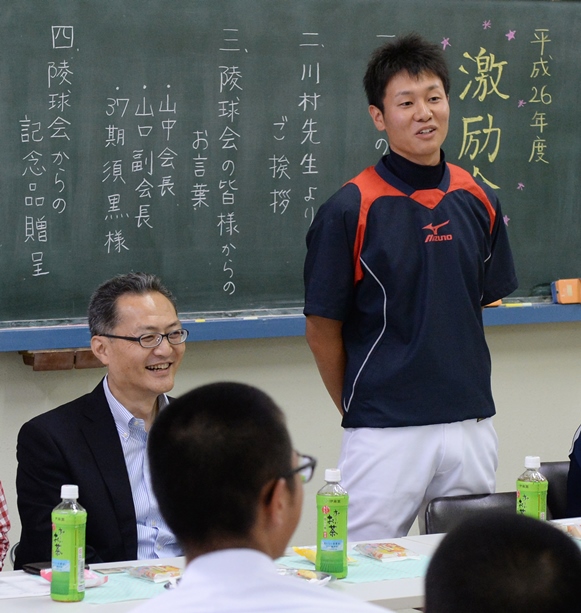 ![]() あいさつする川村監督(右)。 左は陵球会の山中会長 |