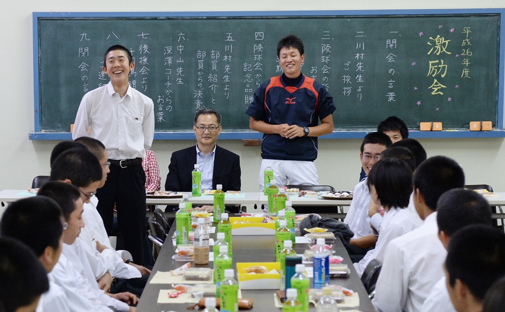 激励会には野球部へ毎年、道具などの購入を通して支援をしている陵球会の山中会長、山口副会長も出席。 今年度はキャッチャー道具3セット、金属バット3本、投球練習場の投手板が寄贈され、既に活用されている。